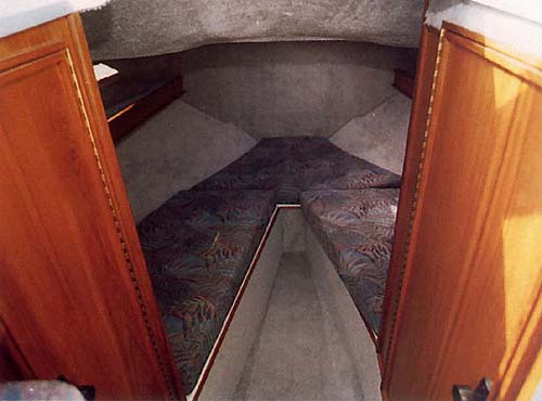 Two berths in the fore cabin easily convert into a full width bed. There is a locker to port and a toilet to starboard.